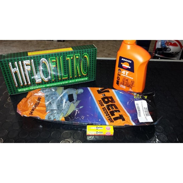 il kit è composto da: 1 Lt olio Repsol 10W40, 1 filtro aria, 1 candela NGK CR8EH9, 1 cinghia trasmissione Mitsuboshi, 1 serie rulli variatore.